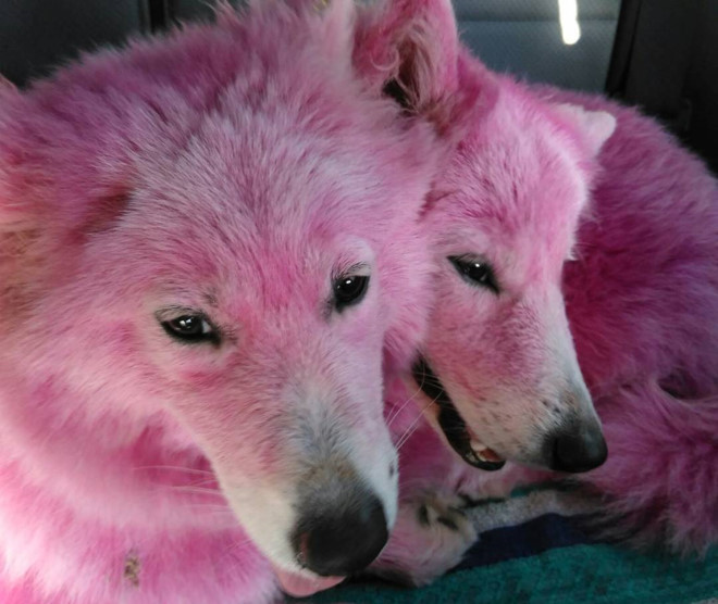 Theo The Sun, nhân viên cứu hộ khi tìm thấy ba chú chó trong rừng cách thành phố Gelendzhik, Nga khoảng 56 km. Có một con bị thương do súng bắn và cả 3 đều bị chủ nhân nhuộm lông thành màu hồng và xanh. Cả ba chú chó đã được đưa đến bác sỹ thú ý ở thủ đô Moscow.