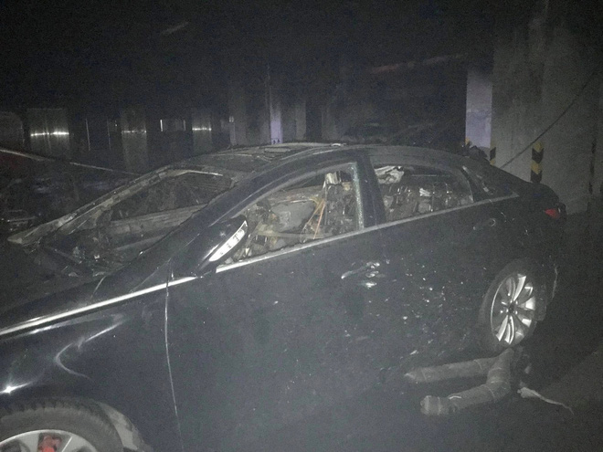 Hầm gửi xe nơi đám cháy bùng phát, toàn bộ các phương tiện đã bị thiêu rụi - Ảnh: FB