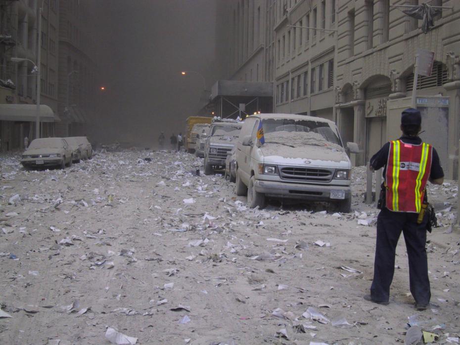 | Tro bụi bao phủ đường phố tại khu vực kinh doanh của thành phốNew York sau khi WTC đổ sập ngày 11/9/2001. Ảnh: Bernadette Tuazon/AP |