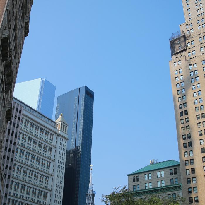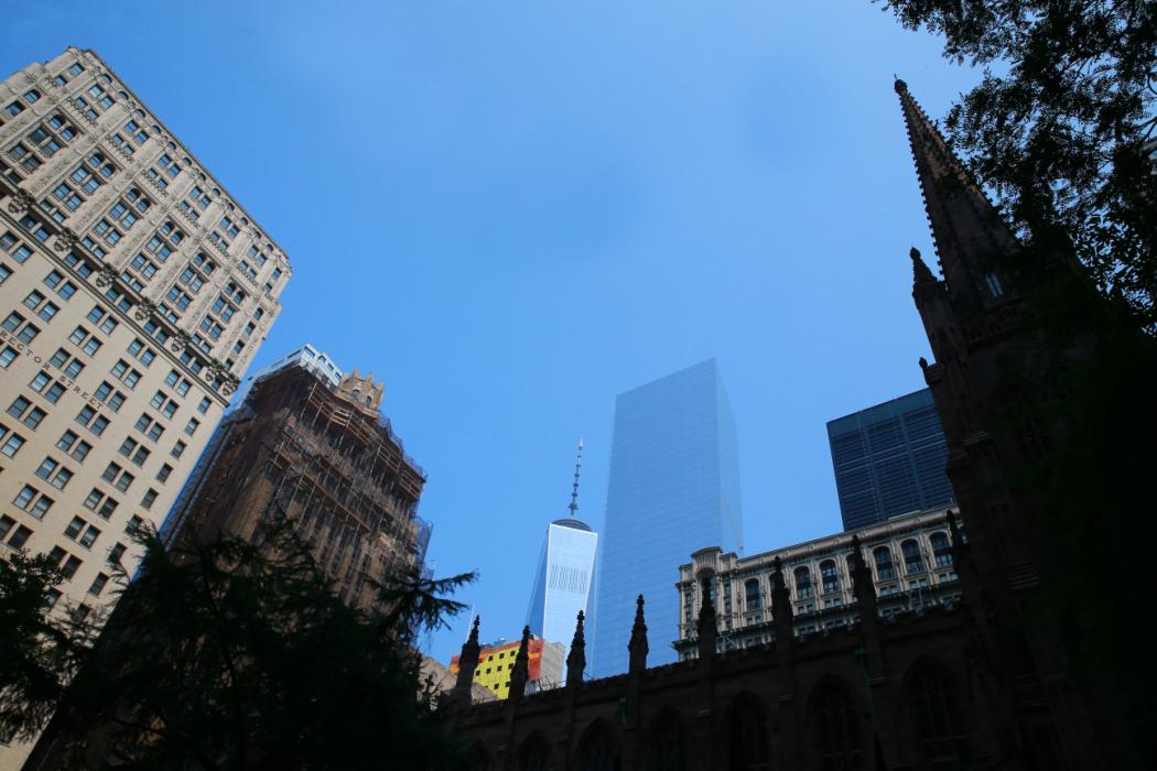 | Những tòa nhà WTC mới và gác chuông nhà thờ Trinity được nhìn từ đường Broadway và Rector ngày 5/9/2015. Ảnh: Gordon Donovan/Yahoo News |