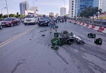 Cú va chạm mạnh khiến 4 xe máy bị bắn văng vài mét trên cầu và hư hỏng nặng. Ít nhất 4 người bị thương được đưa đi cấp cứu.