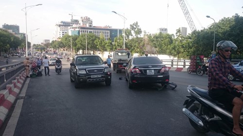 Chiếc ôtô con lưu thông qua cầu vượt theo hướng Nguyễn Chí Thanh - Liễu Giai bất ngờ lấn sang làn đường đối diện, đâm liên tiếp vào 4 xe máy.