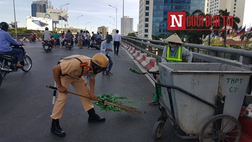| Chiến sĩ CSGT tham gia thu dọn hiện trường |
