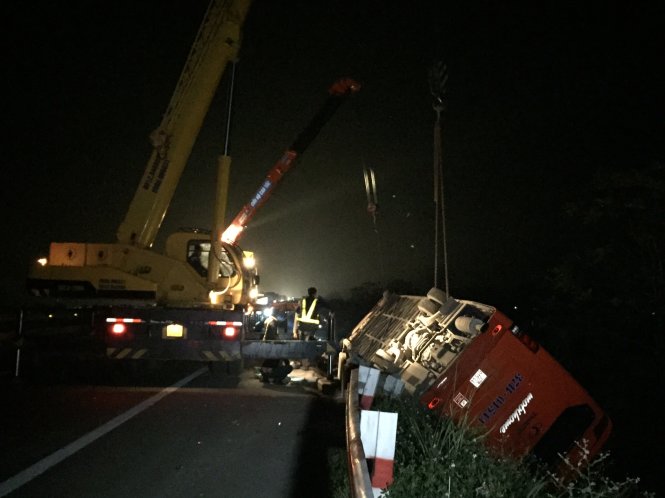 Tại hiện trường vụ Tai nạn giao thông thảm khốc trên cao tốc Pháp Vân -Cầu Giẽ, khiến 19 người thương vong, xe khách và xe tải lật ra nằm bên lề đường, bị biến dạng, hư hỏng nặng.