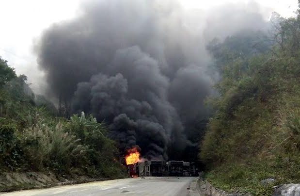 | Sau cú va chạm giữa xe bồn và xe khách, chiếc xe bồn lật ngang và bốc cháy, khói nghi ngút. Ảnh internet |