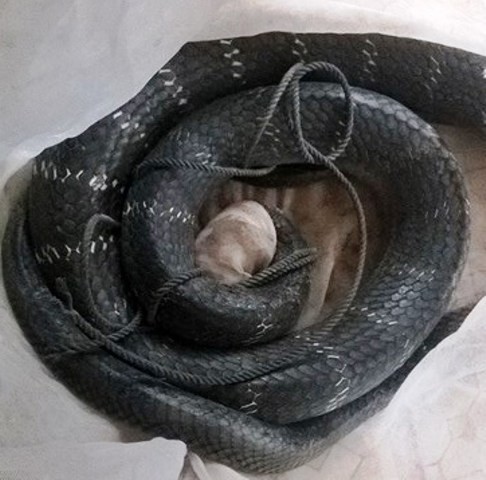 Trước đó, khoảng 9h sáng 9/10, một nhóm thanh niên phát hiện một con rắn lớn màu đen nằm cuộn tròn trốn trong các bao phân để dưới sàn nhà ông Lê Văn Bồng (ngụ ấp K9, xã Phú Đức, huyện Tam Nông).