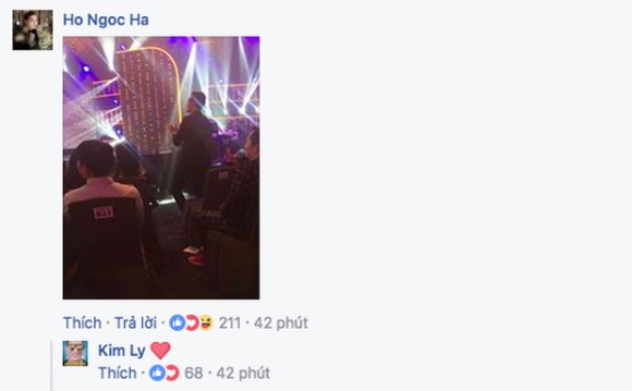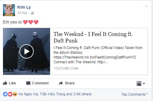 Mới đây trên trang Facebook của mình, Kim Lý gây chú ý khi chia sẻ bài hát “I Feel It Coming” của The Weekend. Kèm với đó, nam diễn viên viết: “Em yêu”. Hồ Ngọc Hà đã lập tức đáp lại lời gọi đầy tình tứ này bằng hình ảnh của Kim Lý trong show diễn “Love Songs: Cả một trời thương nhớ”. Trong đó, anh thể hiện rõ sự hào hứng khi đứng hẳn lên để vỗ tay cổ vũ Hồ Ngọc Hà. Kim Lý “thả tim” trước lời đáp trả đáng yêu của Hà Hồ.
