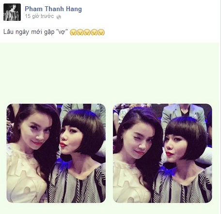 Không những vậy Hà Hồ còn gọi Thanh Hằng là "chồng" rất thân mật. Đáp lại tình cảm của Hồ Ngọc Hà, Thanh Hằng cũng dành cho Hà Hồ những cử chỉ thân mật, âu yếm không khác gì cho người yêu, kèm theo đó là dòng status tình cảm "Lâu ngày mới gặp "vợ".