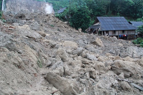 Tại hiện trường, một vạt núi đất đá với hàng nghìn khối đã vùi lấp hoàn toàn những căn nhà của người dân nơi đây. Đây là những hộ đồng bào người dân tộc Mường đã sinh sống lâu đời ở khu vực này.