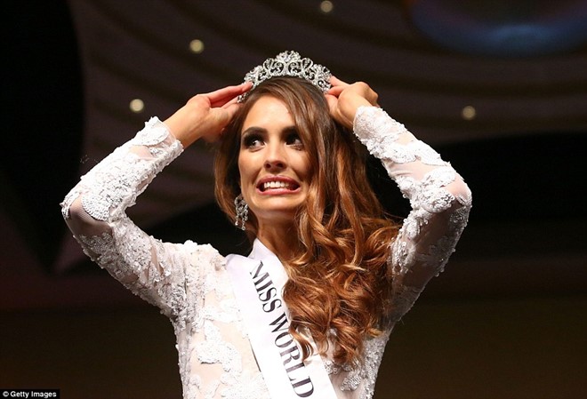 | Tân Hoa hậu lúng túng và nhăn nhó, nhưng cô đã đỡ được chiếc vương miện. |
