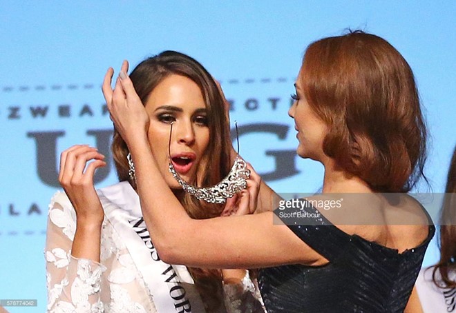 | Người đẹp Madeline Cowe, 23 tuổi, đăng quang Hoa hậu Thế giới Australia hôm 22/7. Cô nhận vương miện từ người tiền nhiệm Tess Alexander trong niềm hạnh phúc vỡ òa. Ngay trong giây phút đăng quang tối 22/7 vừa qua, vương miện lấp lánh đã rớt khỏi đầu cô, gây ra một khoảnh khắc khó xử cho cả tân Hoa hậu và người trao vương miện. |