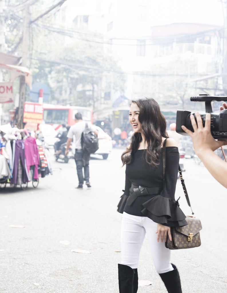 | Thời tiết Hà Nội se lạnh, Hoa hậu diện chiếc áo len ôm sát, lộ bờ vai trần gợi cảm khoe vóc dáng nhỏ nhắn mà thanh lịch, cổ điển, Hoa hậu Sương Đặng thu hút sự chú ý của nhiều người khi chị dạo chợ Hàng Bè. |