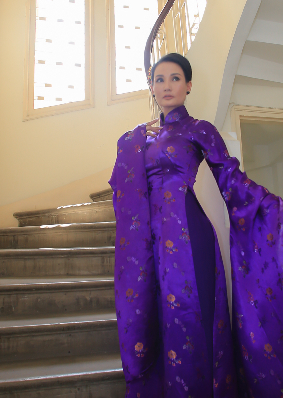 | Quý bà Sương Đặng diện thiết kế mang hơi hướng cung đình với tay loe rộng mang hình ảnh của những quý phi xưa. |