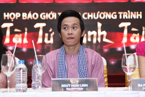 Diện áo bà ba khăn rằng, NSƯT Hoài Linh chưa thật sự khỏe hẳn nhưng vẫn tranh thủ đến dự họp báo Tài tử tranh tài.