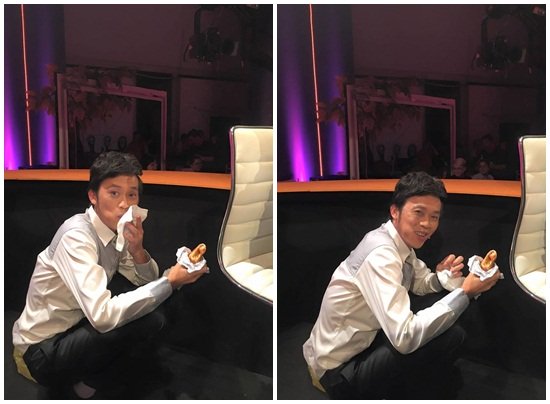 NSƯT Hoài Linh ăn vội chiếc bánh trước khi ghi hình. Ảnh internet |