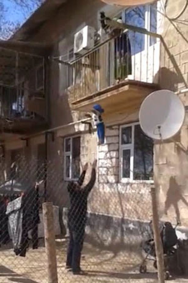 Đứa trẻ được cho là một bé trai 18 tháng tuổi, tại Kazakhstan. Đứa bé được mẹ bế đứng trên ban công và một người đàn ông, theo nhân chứng là cha đứa bé đang đứng dưới mặt đất, sẵn sàng bắt lấy đứa bé khi người mẹ thả xuống.