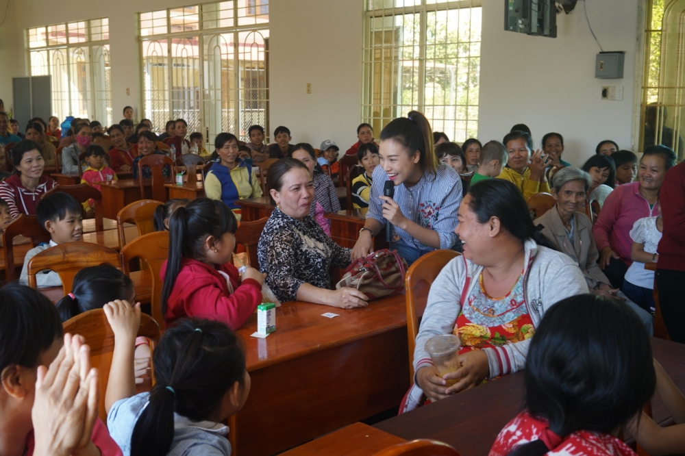 | Cô thân thiện bắt tay, trò chuyện khiến không khí buổi từ thiện có phần tươi vui. Cũng như địa điểm trước, những nhu yếu phẩm như sữa, đường, mì, dầu ăn đã được gửi đến ban vận hành trung tâm. Riêng các em nhỏ được đoàn Từ thiện của Hoàng Oanh dành tặng cho những bao lì xì đỏ thắm. |