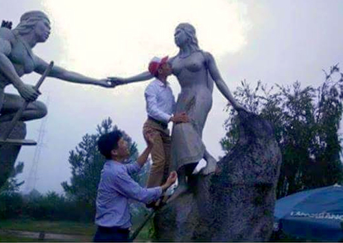 Trước đó ngày 22/7, một trang Facebook cá nhân đăng hình ảnh người đàn ông leo lên bức tượng đá tình yêu Lang Biang và hôn vào ngực tượng, phía bên trái là một người đàn ông ngước nhìn lên với vẻ mặt thích thú.
