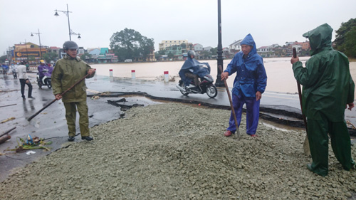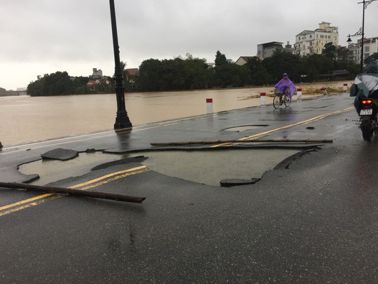 Một đoạn mặt đường ở phía sông Hương bị xói lở tạo thành hàm ếch. những vết nứt xuất hiện và những ụ bê tông nhựa trồi lên khiến mặt đường bị cong vênh. Giao thông qua Đập Đá trong sáng 8.11 bị cản trở vì công trình này hư hỏng.