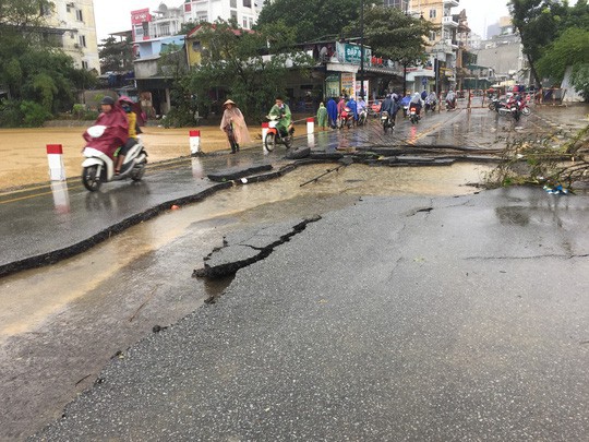 Ghi nhận tại hiện trường, trên mặt đường, lớp nhựa thảm trên cùng đã bị lũ "cày" bong tróc 5-6 điểm, trải dài phía bên trái theo hướng từ đường Nguyễn Sinh Cung sang đường Lê Lợi. Mỗi điểm sâu từ 20-30 cm, rộng từ 1 m2 đến trên 30 m2.