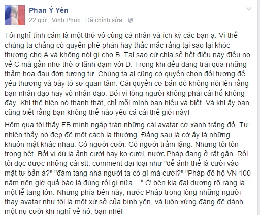 Trong khi nhiều cư dân mạng vẫn cho rằng hoạt động đồng loạt thay ava trên facebook để chia sẻ với người dân Mỹ là “theo phong trào”, “giả tạo”, “làm màu”...thì cây viết trẻ Phan Ý Yên đã chia sẻ những dòng suy nghĩ rất thực về vấn đề này và được cộng đồng mạng ủng hộ.