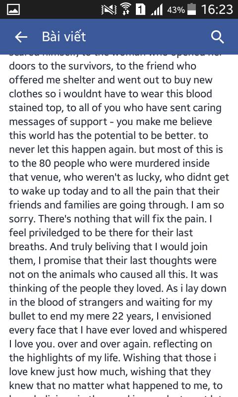 | Đoạn chia sẻ của Isobel Bowdery- người đã tự nhận mình là nạn nhân may mắn sống sót trong vụ nổ bom vào ngày 13/11 tại Paris. Ảnh: Minh Di |