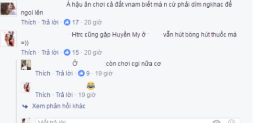 Ngay sau đó, một người bạn của Kỳ Duyên tên H.N lên tiếng tố người tung loạt ảnh quá khứ hút thuốc lá của Kỳ Duyên chính là Á hậu Huyền My. H.N chia sẻ: “Á Hậu bỏ ra bao nhiêu tiền để viết bài này. Thổi bóng có sao đâu”. Ngay dưới phần bình luận, H.N và bạn bè đã chỉ đích danh nàng “Á hậu” ấy chính là Huyền My. Thậm chí còn cho rằng bản thân Huyền My cũng ăn chơi cũng chẳng kém gì Kỳ Duyên.