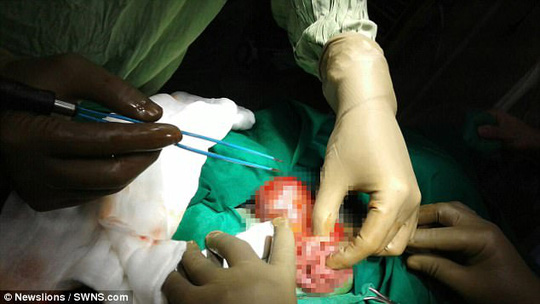 Các bác sĩ đã tiến hành phẫu thuật để cắt bỏ phần bào thai hư dài khoảng 7cm, nặng 150 g trên.
