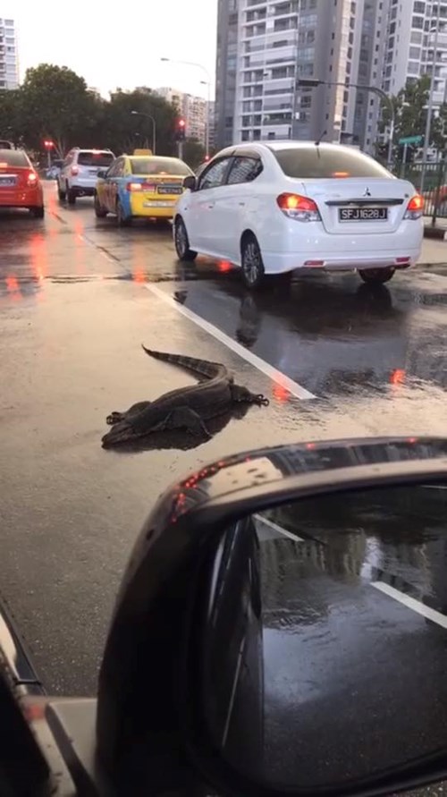 Một con kỳ đà có kích thước "khủng" đã xuất hiện tại giữa đường tại khu vực Buangkok (Singapore) khiến cho giao thông bị ùn tắc.