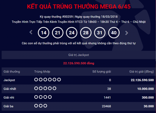 Trước đó, tại kỳ quay thưởng thứ 259 của xổ số Mega 6/45 mở thưởng ngày 18/3 đã không tìm ra chủ nhân của giải Jackpot trị giá 22.126.590.500 đồng.