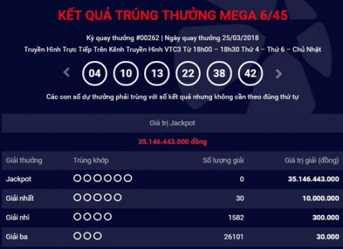 Trước đó, tại kỳ quay thưởng thứ 262 của xổ số Mega 6/45 mở thưởng ngày 25/3 đã không tìm ra chủ nhân của giải Jackpot trị giá 35.146.443.000 đồng.