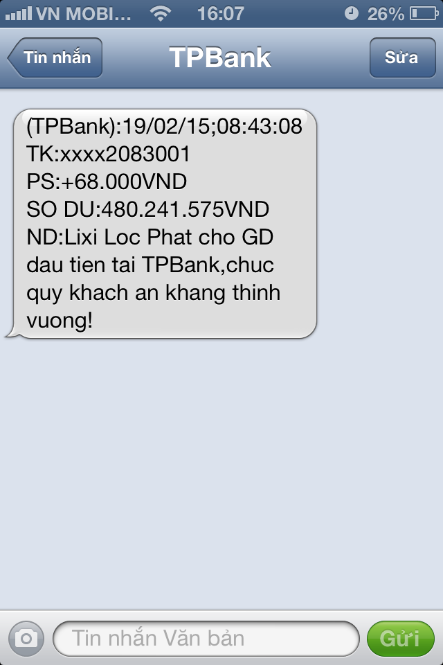 Cụ thể, anh Nguyễn Phương Duy – Cầu Giấy Hà Nội khi giao dịch chuyển khoản qua dịch vụ ebanking của Ngân hàng TMCP Tiên Phong (TPBank) đã nhận được món quà lì xì “Khi thực hiện lệnh chuyển khoản số tiền hơn hai triệu đồng cho người bạn, tôi bất ngờ nhận được tin nhắn lì xì 10.000 đồng từ TPBank” – Anh Duy vui vẻ cho biết.