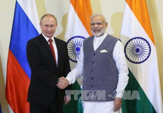 | Tổng thống Nga Vladimir Putin hội đàm với Thủ tướng Ấn Độ Narendra Modi bên lề Hội nghị thượng đỉnh lần thứ 8 Nhóm các nền kinh tế mới nổi (BRICS). Ảnh: EPA/ TTXVN |