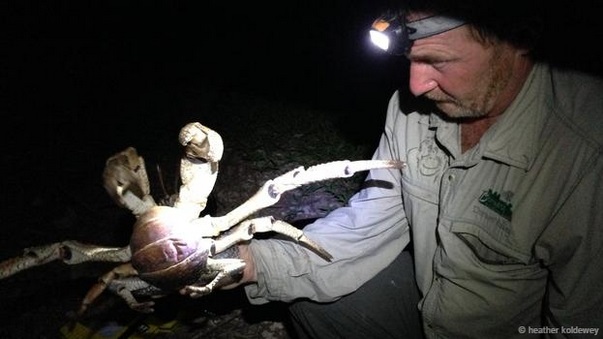 Thành viên nhóm nghiên cứu Peter Carr cầm một con cua dừa