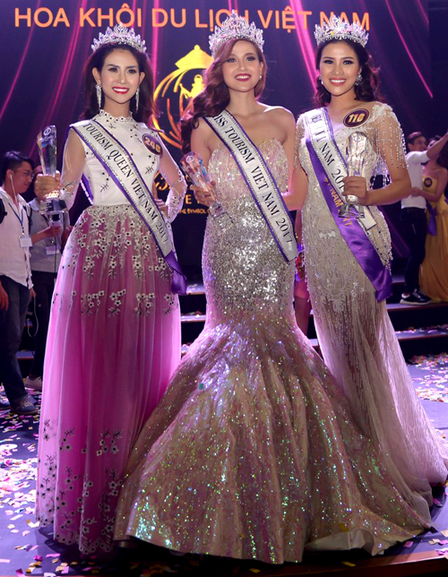 | Khánh Ngân sung sướng khi được xướng tên ở ngôi vị cao nhất. hoa hậu Du lịch Thế giới 2015 Nuchnarin Sinlaparak (trái) và Hoa hậu Hoàn Vũ Thái Lan 2007 Farung Yuthithum lên trao vương miện cho Khánh Ngân. |