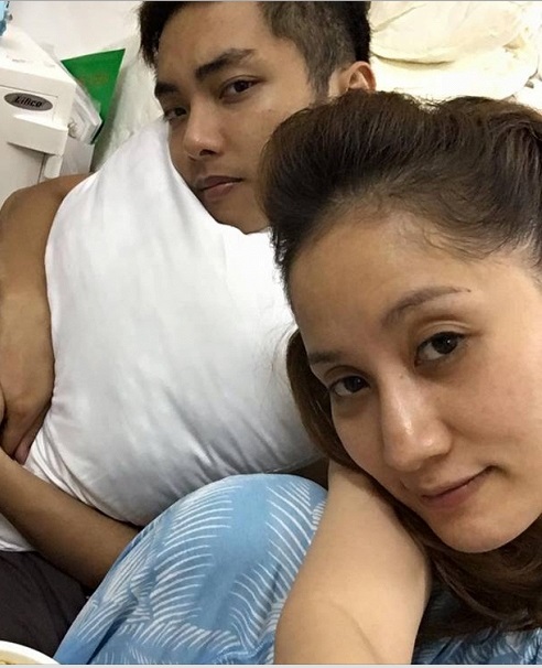 Khác với những hình ảnh lộng lẫy trên sân khấu, Khánh Thi xuất hiện giản dị và đầy tự tin khi khoe mặt mộc bên Phan Hiển. Trong hình, gương mặt Khánh Thi lộ rõ sự mệt mỏi. Dù vậy, cô vẫn nở cùng nụ cười rạng rỡ khi chụp ảnh cùng "chồng trẻ".