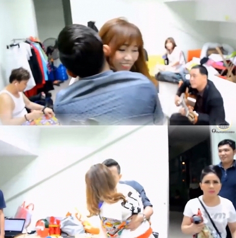 Khi quay chương trình, cặp đôi vẫn tranh thủ lôi nhau ra góc khuất để ôm hôn. |