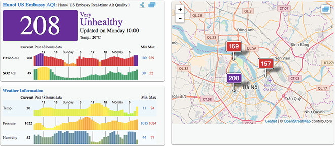 Theo thông số tại trạm đo lường chất lượng không khí đặt tại Đại sứ quán Hoa Kỳ cho biết mức độ ô nhiễm ở Thủ đô đã đạt mức rất cao, chỉ số AQI lên tới 207 thuộc nhóm "Rất không lành mạnh".