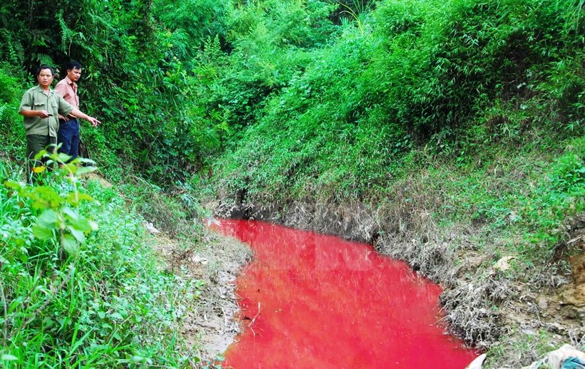 | Dòng suối bỗng dưng chuyển thành màu đỏ "máu" bất thường khiến người dân hoang mang, lo lắng. Ảnh nguồn:Dantri |