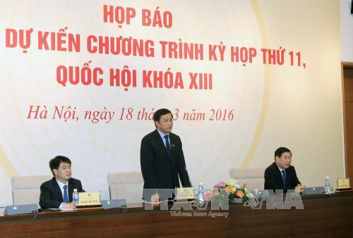 Kỳ họp thứ 11 – Kỳ họp cuối cùng của Quốc hội khóa XIII sẽ khai mạc vào ngày 21/3 tại Nhà Quốc hội, Thủ đô Hà Nội và dự kiến sẽ bế mạc vào ngày 12/4. Nét mới ở cuộc họp báo quốc tế thông báo về nội dung Kỳ họp này được tổ chức chiều 18/3 tại Nhà Quốc hội là cùng tham gia chủ trì với Tổng Thư ký, Chủ nhiệm Văn phòng Quốc hội Nguyễn Hạnh Phúc còn có hai Phó Tổng Thư ký Quốc hội mới được bổ nhiệm gồm: Phó Chủ nhiệm Văn phòng Quốc hội Nguyễn Hữu Toàn và Phó Chủ nhiệm Ủy ban Pháp luật của Quốc hội Lê Minh Thông.