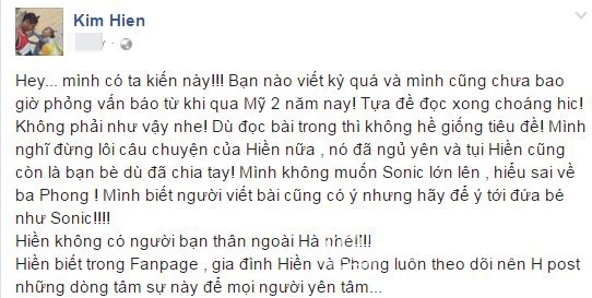 Kim Hiền "choáng" khi đọc được thông tin với tiêu đề: "Nể phục nghị lực của Kim Hiền khi làm mẹ đơn thân: Tôi phát hiện ra chồng ngủ với bạn thân mình đúng vào ngày kỷ niệm 6 năm yêu nhau". Kim Hiền đã lên tiếng phủ nhận chuyện này. Đồng thời nữ diễn viên mong mọi người sẽ không nhắc lại chuyện quá khứ. Hơn nữa, Kim Hiền không muốn khi con trai lớn lên hiểu sai về bố ruột.