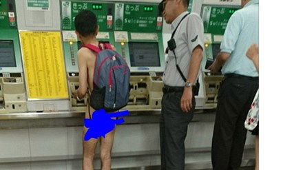 Hình ảnh nam du khách không mặc đồ đứng mua vé tàu được đăng tải trên mạng xã hội. Ảnh: Japan Today |