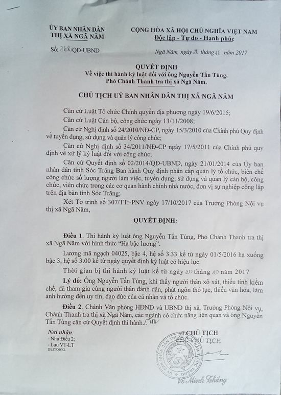 Theo đó, Quyết định kỷ luật đối với ông Nguyễn Tấn Tùng với hình thức “Hạ bậc lương”. Cụ thể từ lương mã ngạch 04025, bậc 4 hệ số 3,33 hạ xuống bậc 3, hệ số 3,00.