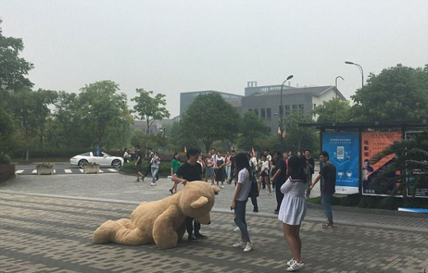 Chàng trai đi một chiếc siêu xe hạng sang Porsche 911 Targa cùng một chú gấu bông cao tới hơn 2.5 mét đỗ ngay bên ngoài khu giảng đường chính để chờ nhân vật nữ chính xuất hiện.