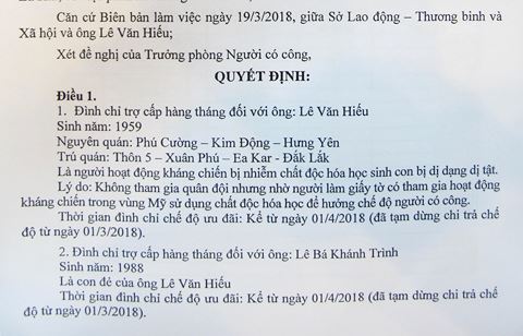 Theo đó, quyết định ghi rõ đình chỉ trợ cấp hàng tháng kể từ ngày 1/4/2018 đối với ông Hiếu (59 tuổi).