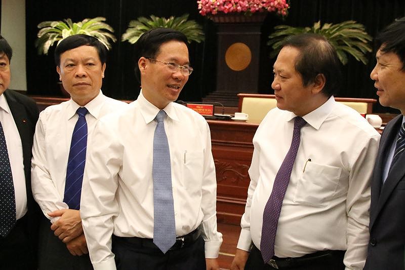 Trưởng Ban Tuyên giáo Trung ương Võ Văn Thưởng trao đổi với Bộ trưởng Trương Minh Tuấn bên lề hội nghị. Ảnh: Pháp luật TPHCM |