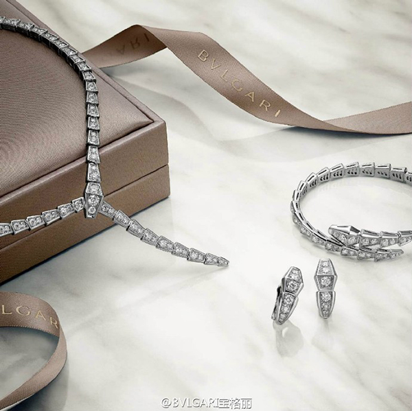 | Dây chuyền, hoa tai và vòng tay đều nằm trong bộ Serpenti với hàng loạt những viên kim cương được gắn vô cùng tinh xảo. |