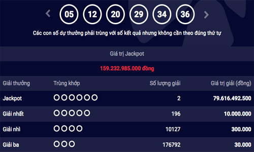 Theo thông tin từ Công ty xổ số điện toán Việt Nam (Vietlott), kỳ quay thứ 69 của loại hình xổ số tự chọn đã tìm ra dãy 6 con số may mắn trúng giải đặc biệt. Tổng giá trị giải độc đắc lần này là hơn 159.232.985.000 đồng. Dãy số trúng giải là 05-12-20-29-34-36.