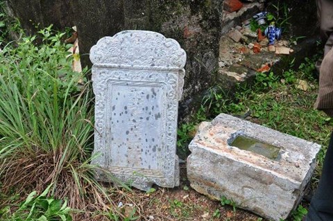 | Tấm bia lăng mộ bà Trần Thị Nga bị kẻ gian đưa ra ngoài. Ảnh Infonet |