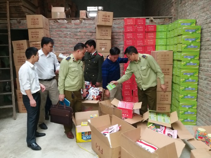 Phát hiện 30.000 gói bánh kẹo không rõ nguồn gốc chuẩn bị đi tiêu thụ. Ảnh: Báo Giao thông |